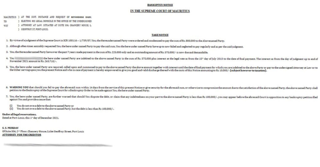 Ce qu’on appelle désormais l’affaire Ritoodoise Daby a pris une nouvelle tournure. C’est, en effet, le moins que l’on puisse dire après qu’un « Bankuptcy Notice » sera servi à un homme de loi très connu et très actif sur les réseaux sociaux, pour la réclamation d’une dette de l’ordre de Rs 575 000. Une dette restée impayée depuis presque 8 ans.