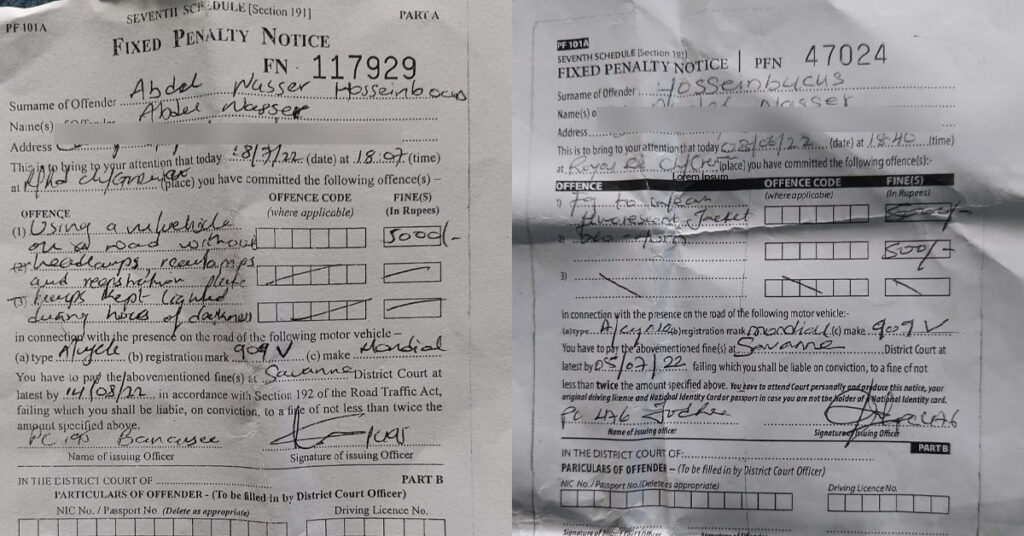 Drôle de situation pour un habitant de Belle Vue, à Chemin Grenier. Nasser Hossenbaccus s’est retrouvé avec deux contraventions, soit l’un émis le 8 juin et l’autre le 18 juillet dernier totalisant une somme de Rs 10 500. Dans la première contravention, la police lui reproche le non port du gilet fluorescent et, que sa moto n’avait pas de klaxon. Tandis que l’autre fait mention des phares défectueux toujours sur le même véhicule. Mais Nasser s’évertue à expliquer qu’il faisait toujours clair ce jour-là, et qu’il n’a pas cru utile d’allumer ses phares. Il déplore le fait que le policier en question lui a servi cette amende à côté de sa maison. « Mone dir la polis là pe fer clair. Mo pe trouvé. Kifer mo bizin alime mo phare. Line pren moi ene contravention. Mo fine ale la Cour pou tomb ene arranzman », confie ce planteur de légumes, qui est aussi comme apiculteur.