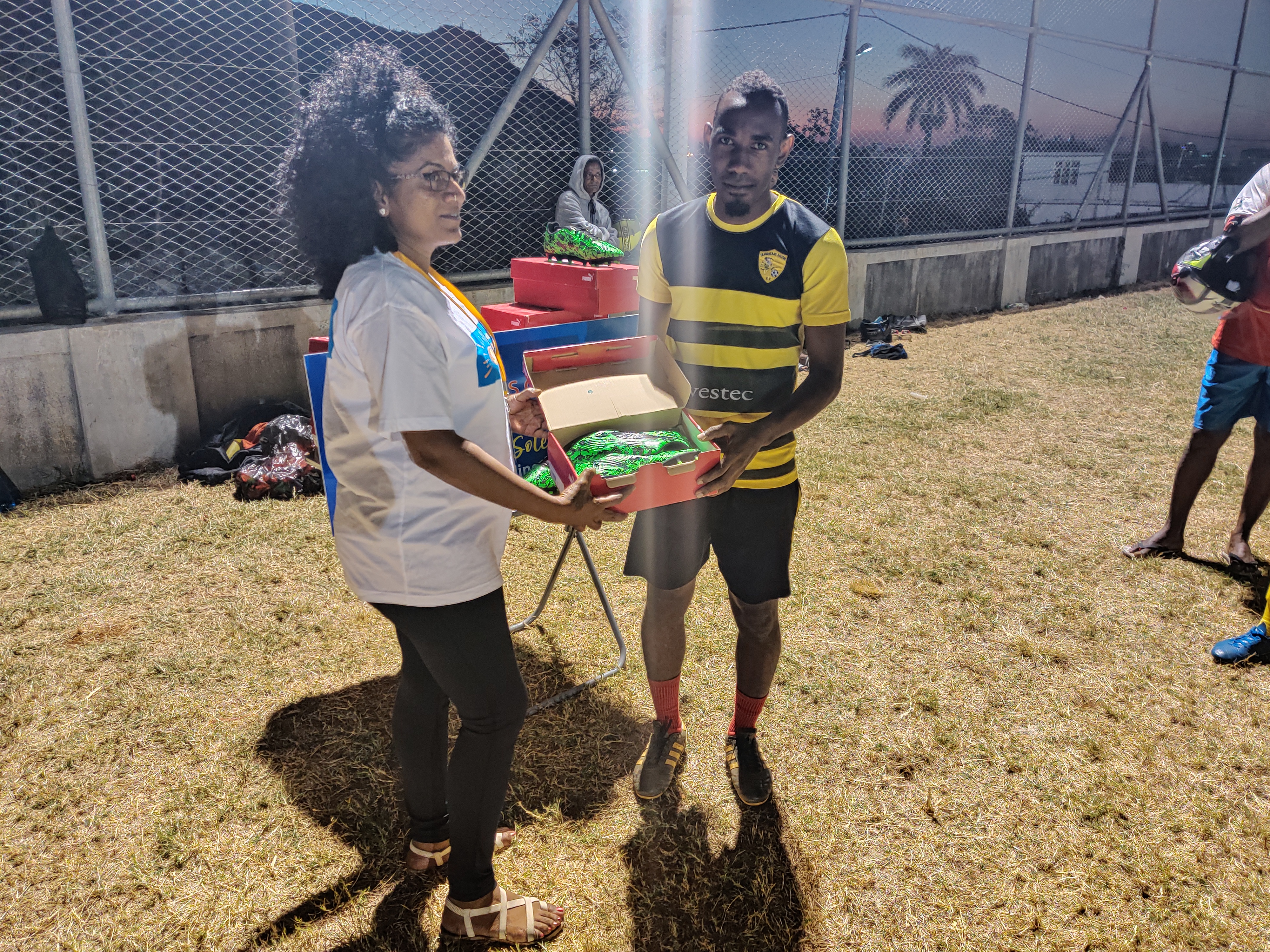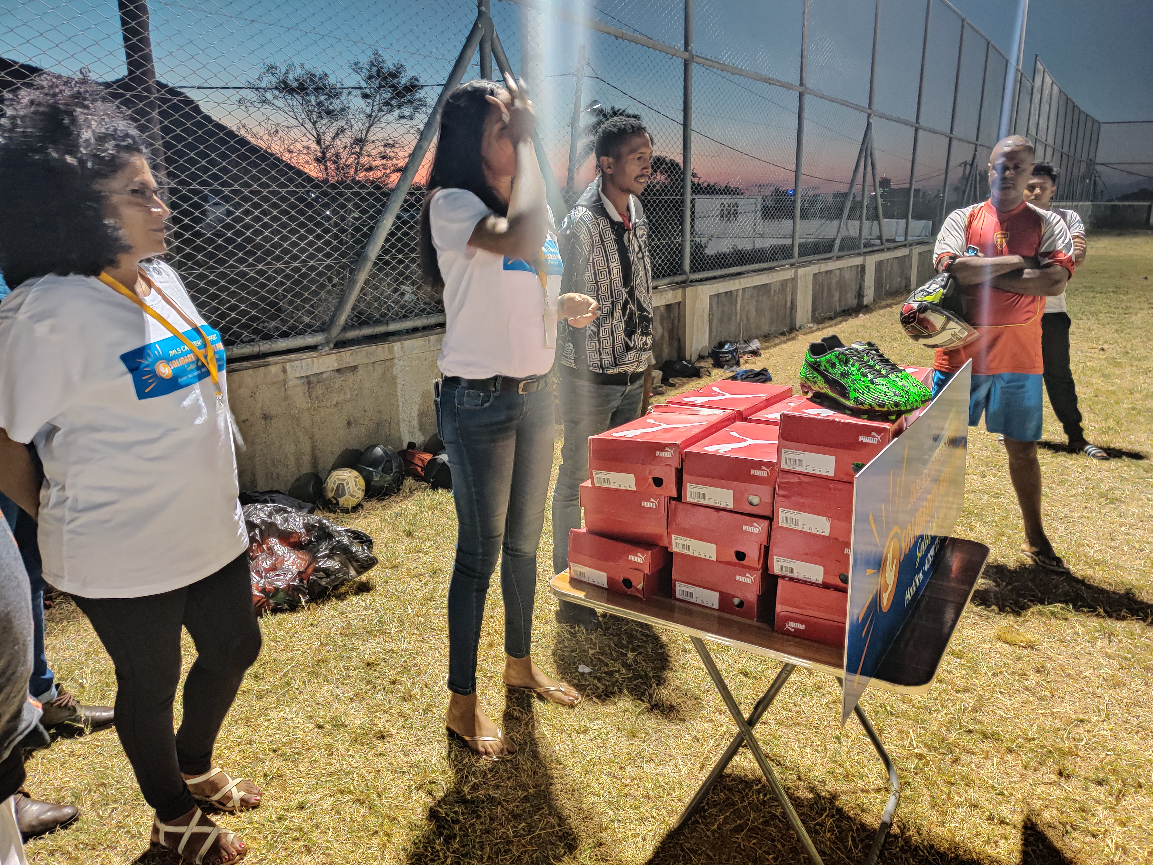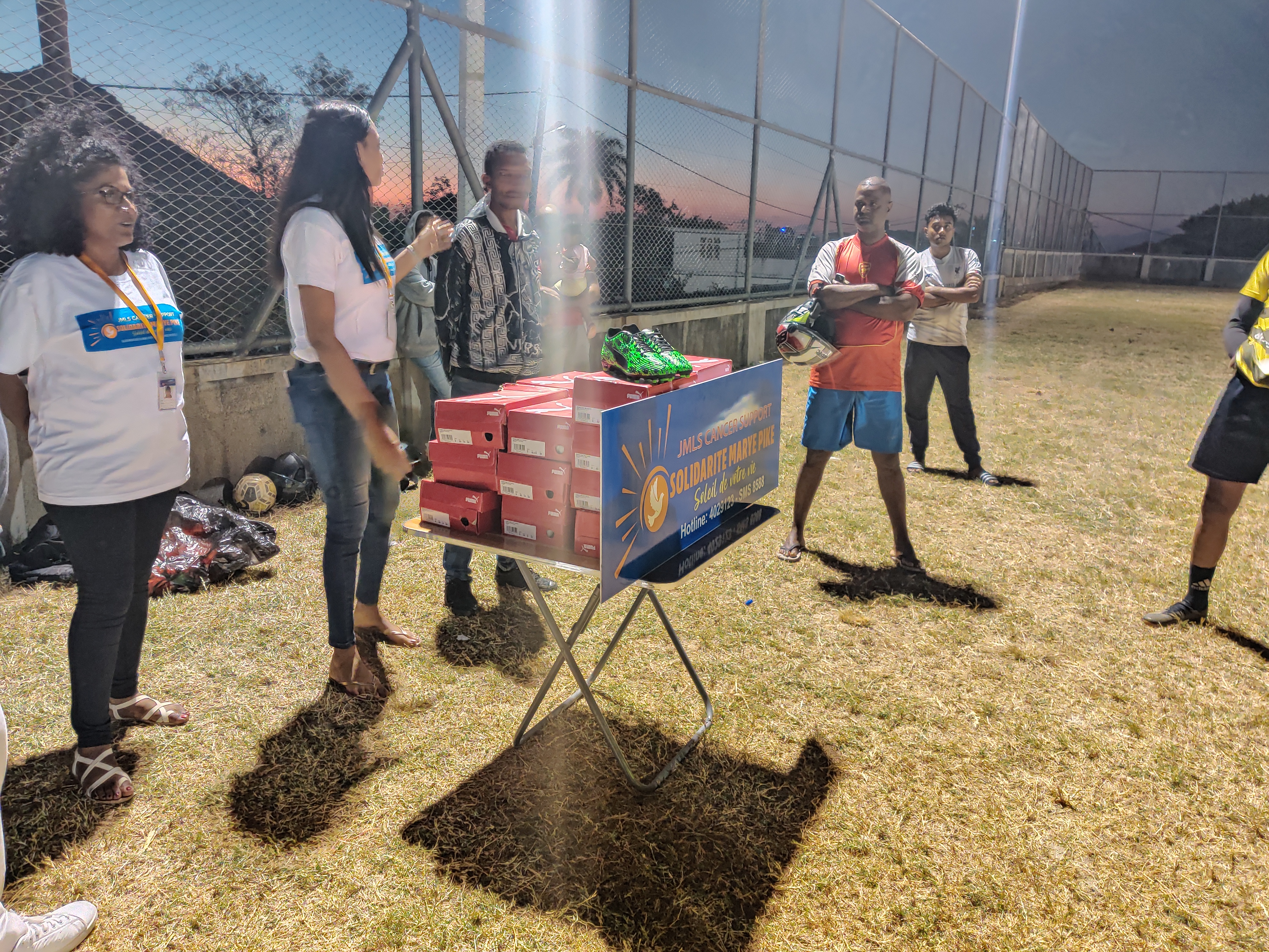 Karen Bocus, Supervising Head de l’association SMP, et Lynemay Touche, Regional Head de la région Ouest de Port-Louis, ont rencontré le club de foot, le mardi 25 août 2020, pour lui remettre ces chaussures qui lui sont si précieuses.