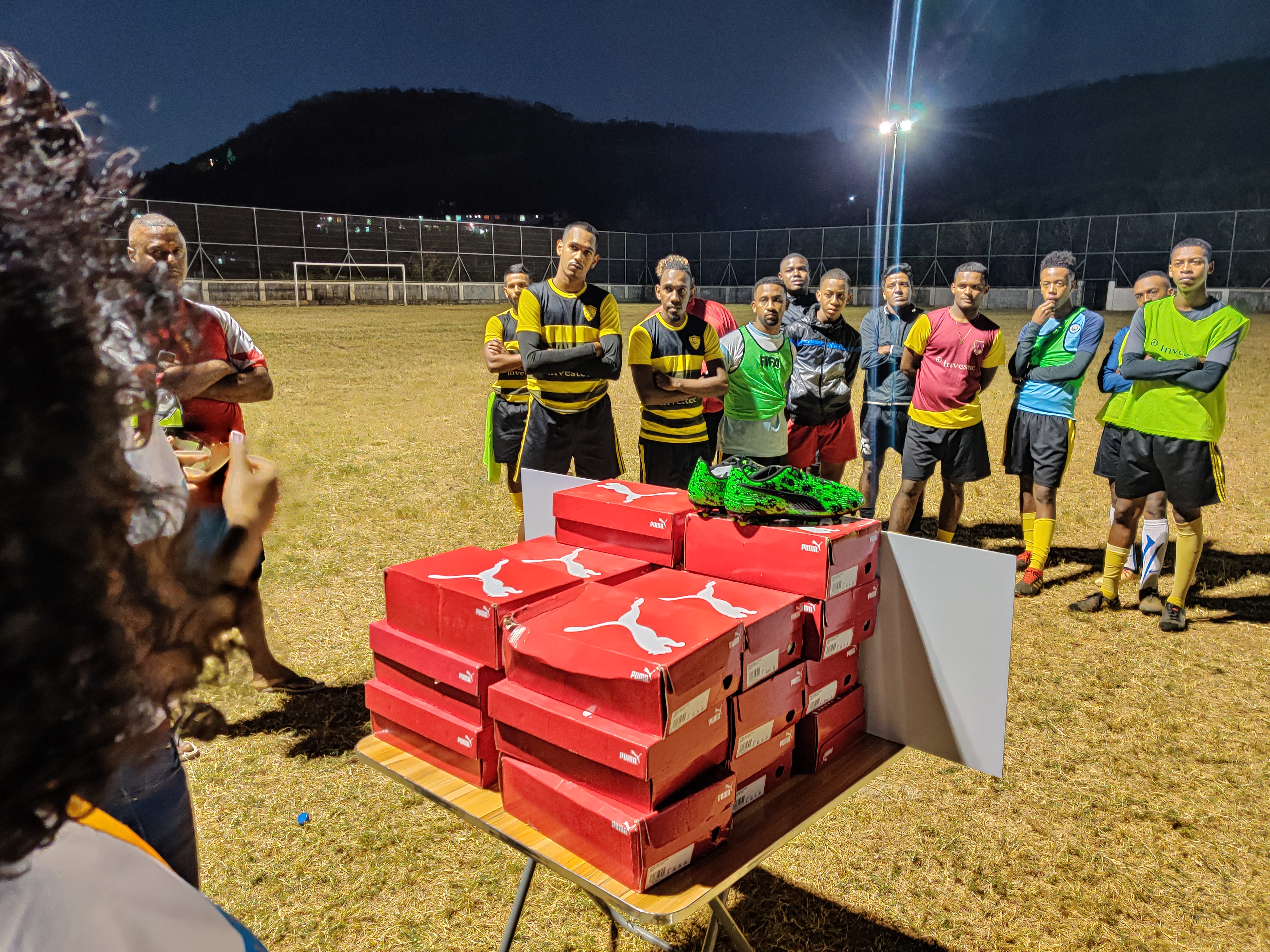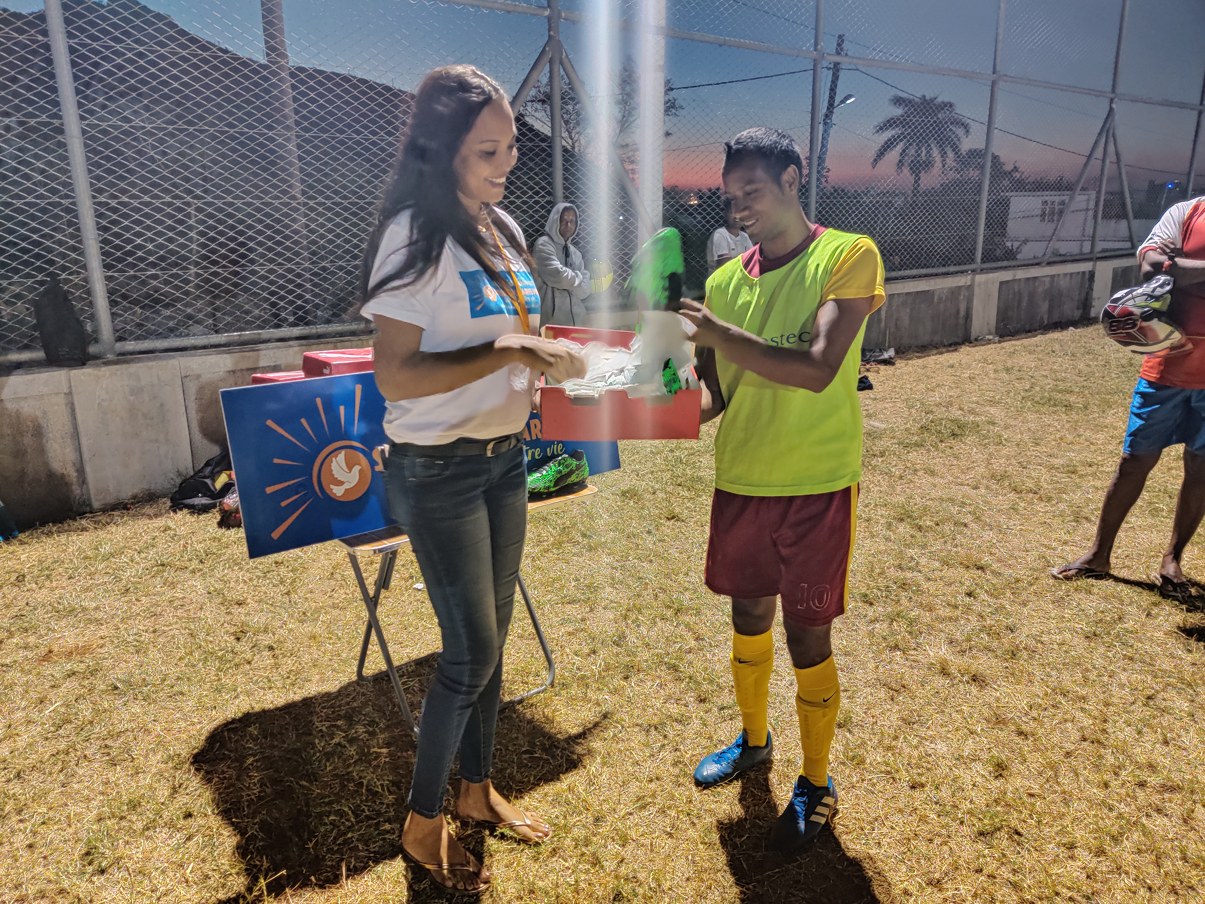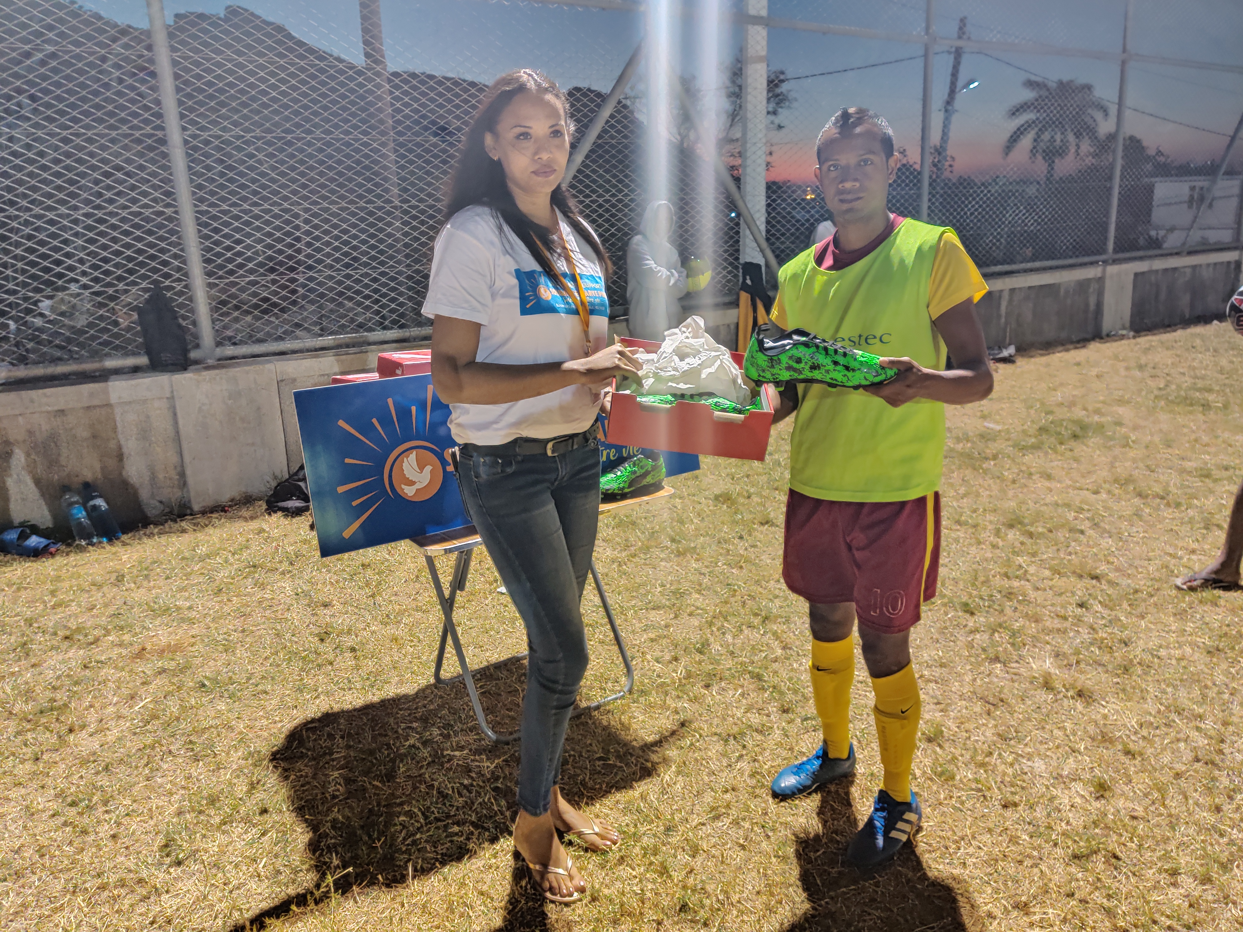 Karen Bocus, Supervising Head de l’association SMP, et Lynemay Touche, Regional Head de la région Ouest de Port-Louis, ont rencontré le club de foot, le mardi 25 août 2020, pour lui remettre ces chaussures qui lui sont si précieuses.