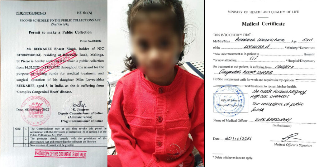 Lovevishka Beekaree est sans aucun doute une petite fille qui déborde de courage. Du haut de ses 5 ans, elle se prépare à subir une nouvelle opération du cœur. Une de plus, en seulement deux ans. Mais la famille de Lovevishka a besoin de trouver Rs 700 000, des Rs 1 400 000 nécessaires, pour cette intervention chirurgicale, déterminante pour le futur de cette jeune fille. Selon sa maman, Lovevishka tente, tant bien que mal, a mené une vie normale depuis sa naissance. Mais en raison du nombre de médicaments qu’elle doit prendre quotidiennement, Lovevishka est souvent fatiguée et doit aussi beaucoup reposer. Ces médicaments ont été prescrits afin de baisser considérablement la pression exercée au niveau du cœur de la jeune fille, afin de permettre cette opération.