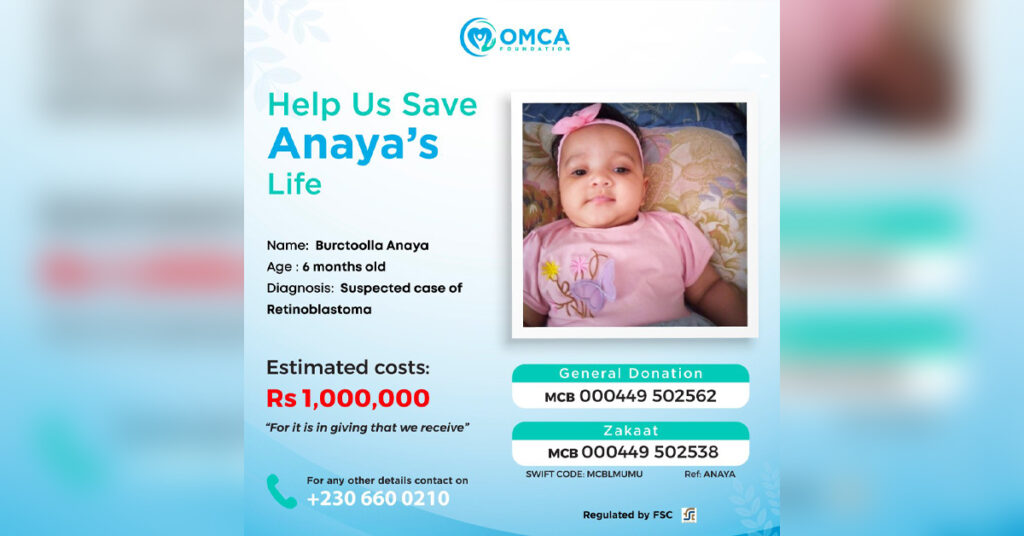 C’est le cas de la petite Anaya, 6 mois et atteinte d’une tumeur à l’œil, notamment appelé un rétinoblastome. L’OMCA Fondation, dont le président est Taslim Dilloo qui a décidé de prendre sous son ombrelle ce nourrisson sans défense. En effet, depuis mercredi, la petite se trouve en Inde, avec ses deux parents, dans l’espoir de trouver les soins les plus appropriés à l’hôpital Fortis Memorial à Gurgaon, avec le soutien de l’OMCA Foundation.