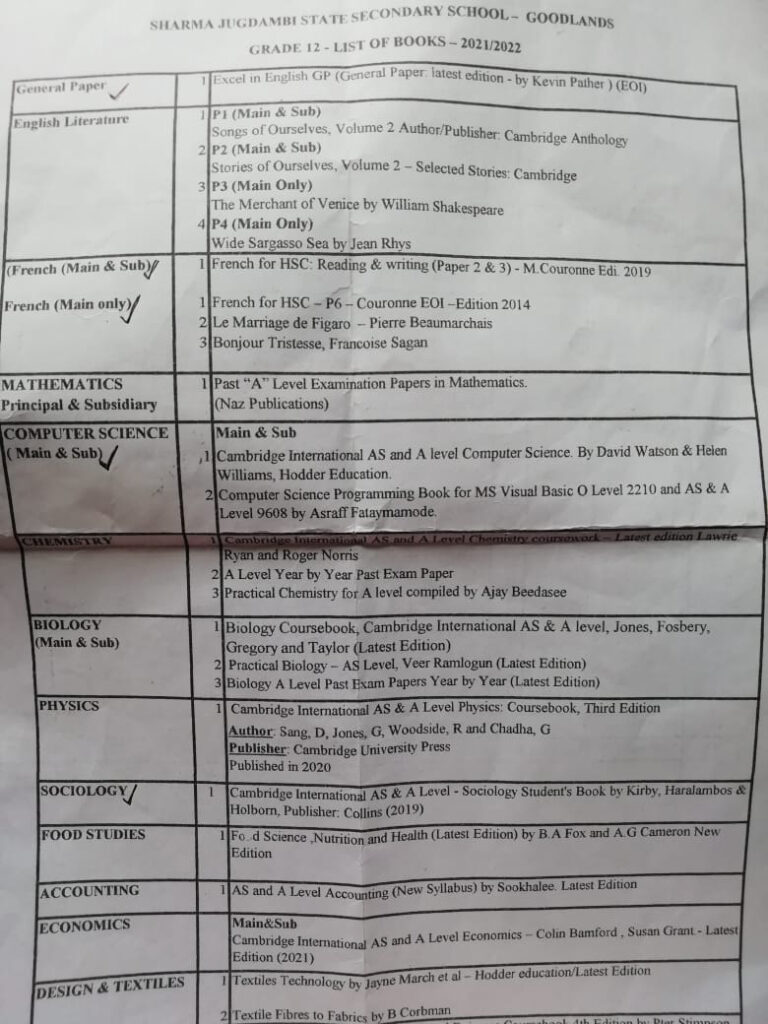 L’association Solidarite Marye Pike relance cet appel à l’aide de Marie Josée. Nous avons évoqué à deux reprises le cas de cette mère et de ses quatre enfants, victimes de violences conjugales. L’ainée de cette famille a stoppé temporairement ses études, par manque de moyens pour acheter des livres. Nous avons demandé à Marie Josée de nous envoyer la liste des livres dont aura sa fille besoin. Ces livres sont cochés dans la liste en photo ci-dessous :