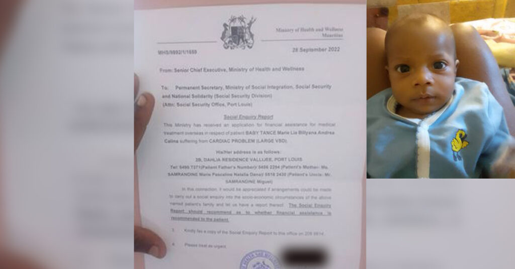 C’est à 17h30, ce mardi 4 octobre, que Marie Pascaline Saramandine et sa fille Maria Lia Tance, embarqueront dans un vol d’Air Mauritius en partance pour Bangalore. Un déplacement facilité par le ministère de la Santé pour tenter de sauver la vie de la petite de 2 mois, qui souffre de troubles cardiaques. En effet, l’urgence de la situation est telle qu’elle oblige un déplacement impératif pour l’hôpital Manipal, en Inde.