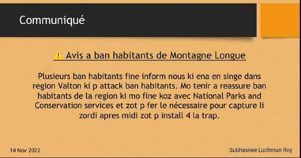 Aussitôt l’appel lancé, la députée Subashnee Luthmun Roy a fait publier sur sa page Facebook un communiqué annonçant des mesures pour la capture de ce singe. Dans ce communiqué, on peut lire que des officiers du National Parks & Conservative Services ont été appelés en renfort. Quatre pièges seront installés pour capturer l’animal dans l’après-midi de ce lundi 14 novembre, dans l’unique espoir que l’animal pointe le bout de son nez.
