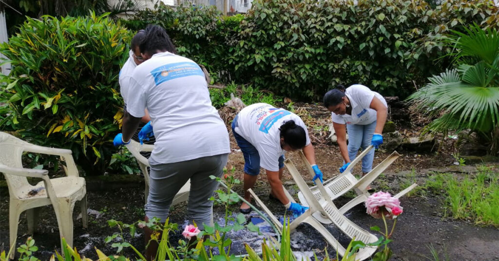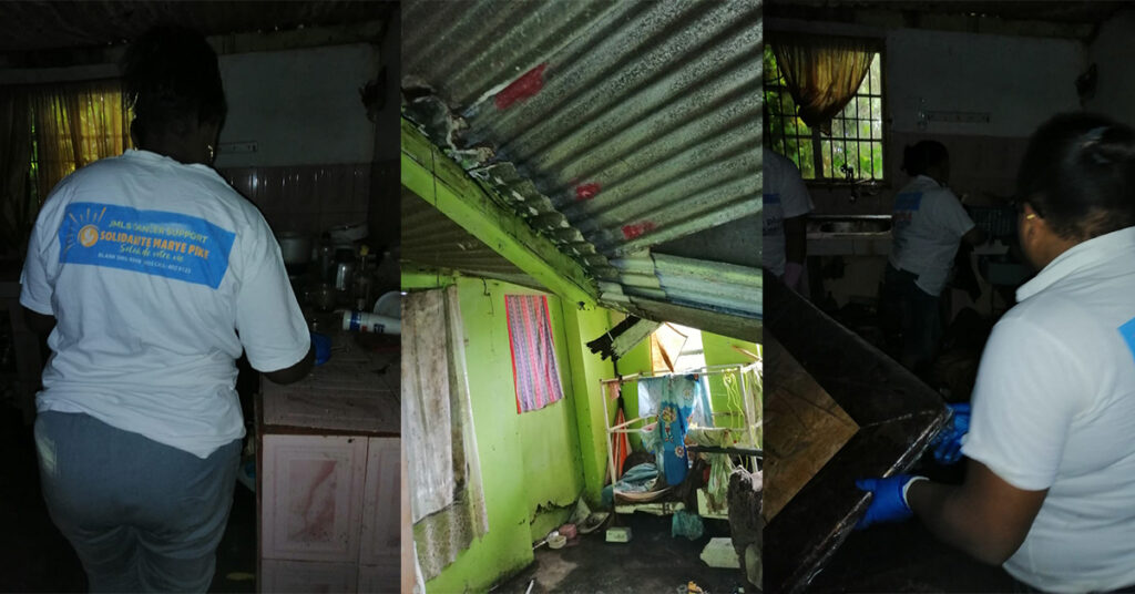 10h30 ! Une équipe de la Solidarite Marye Pike débarque au domicile de l’une de nos bénéficiaires, à Montagne Blanche. Plus précisément à Résidence St Joseph, chez Marie Maricienne Sitamal.