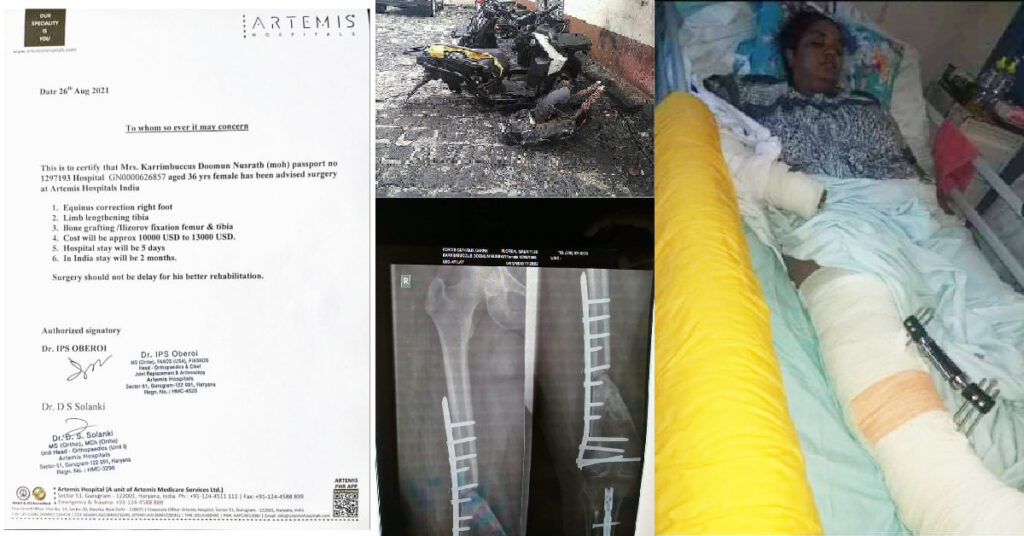 Lors de son accident le 9 mai 2017 à Mont Est Coromandel, cette enseignante de 36 ans a subi un polytraumatisme (une fracture du cubitus, une fracture distale du fémur et une fracture ouverte du tibia). Hospitalisée pendant 6 mois à l’hôpital Jeetoo et 2 mois à celui de Candos, pour son traitement post-accidentel, elle a dû y subir près de 25 interventions chirurgicales.